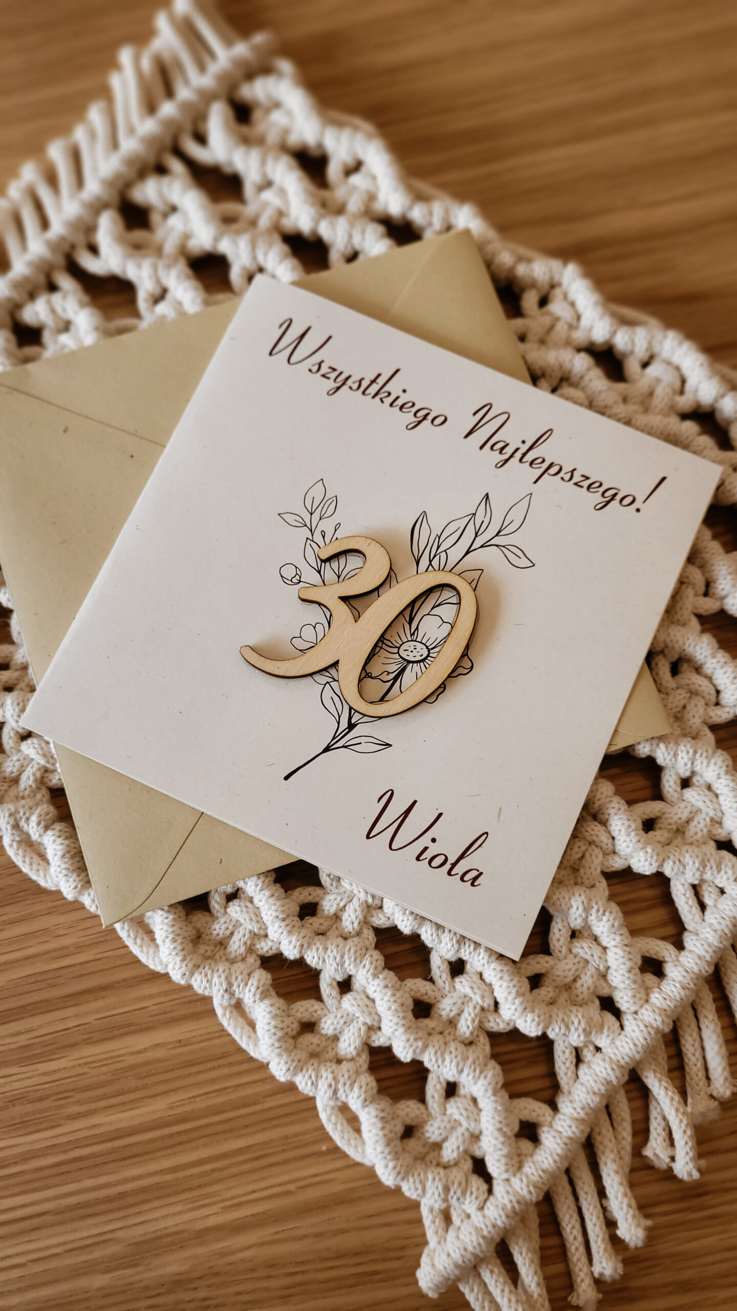 Personalizowana kartka urodzinowa z motywem kwiatowym i drewnianymi dodatkami