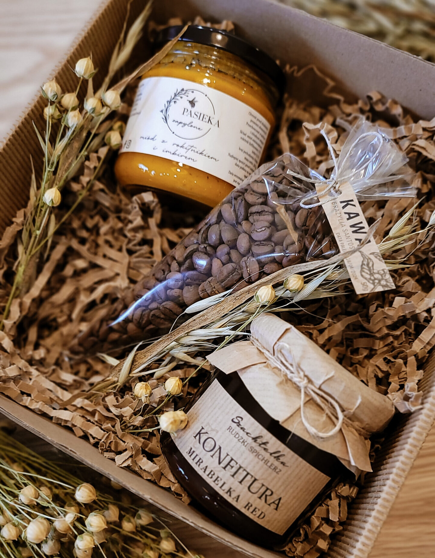 Zestaw prezentowy z domowych przetworów, miodu i kaw – elegancja i smak w jednym